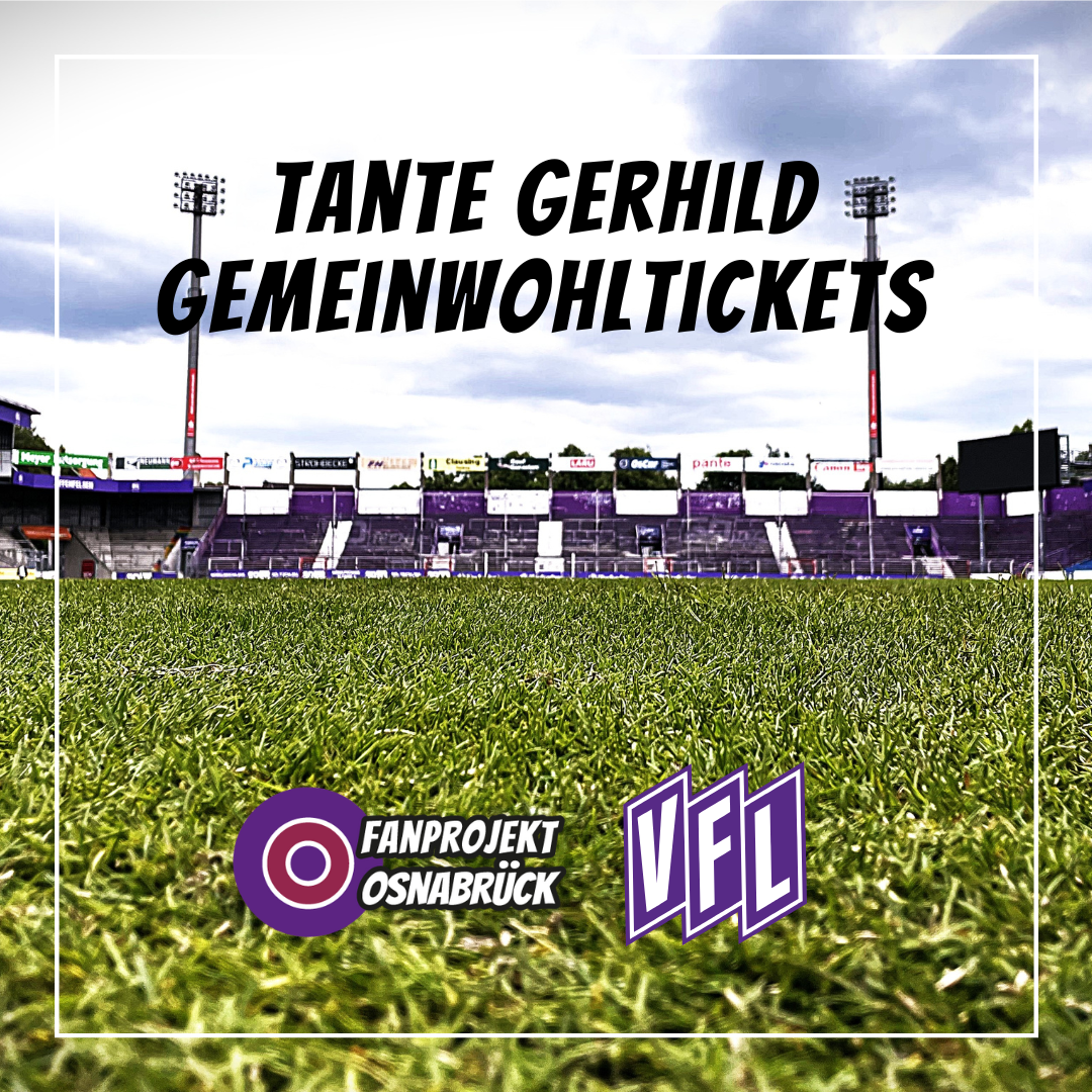 Bei der Ausgabe der Gemeinwohltickets arbeitet der VfL mit uns, dem sozialpädagogischen Fanprojekt Osnabrück, zusammen. In Trägerschaft von Stadt Osnabrück, Diakonie und Caritas verfügen wir über ein Netzwerk bzw. einen hervorragenden Zugang zu Institutionen und Menschen, die für die Tante Gerhild Gemeinwohltickets infrage kommen. Anfragen nehmen wir per Mail an fanprojekt@osnabrueck.de entgegen.