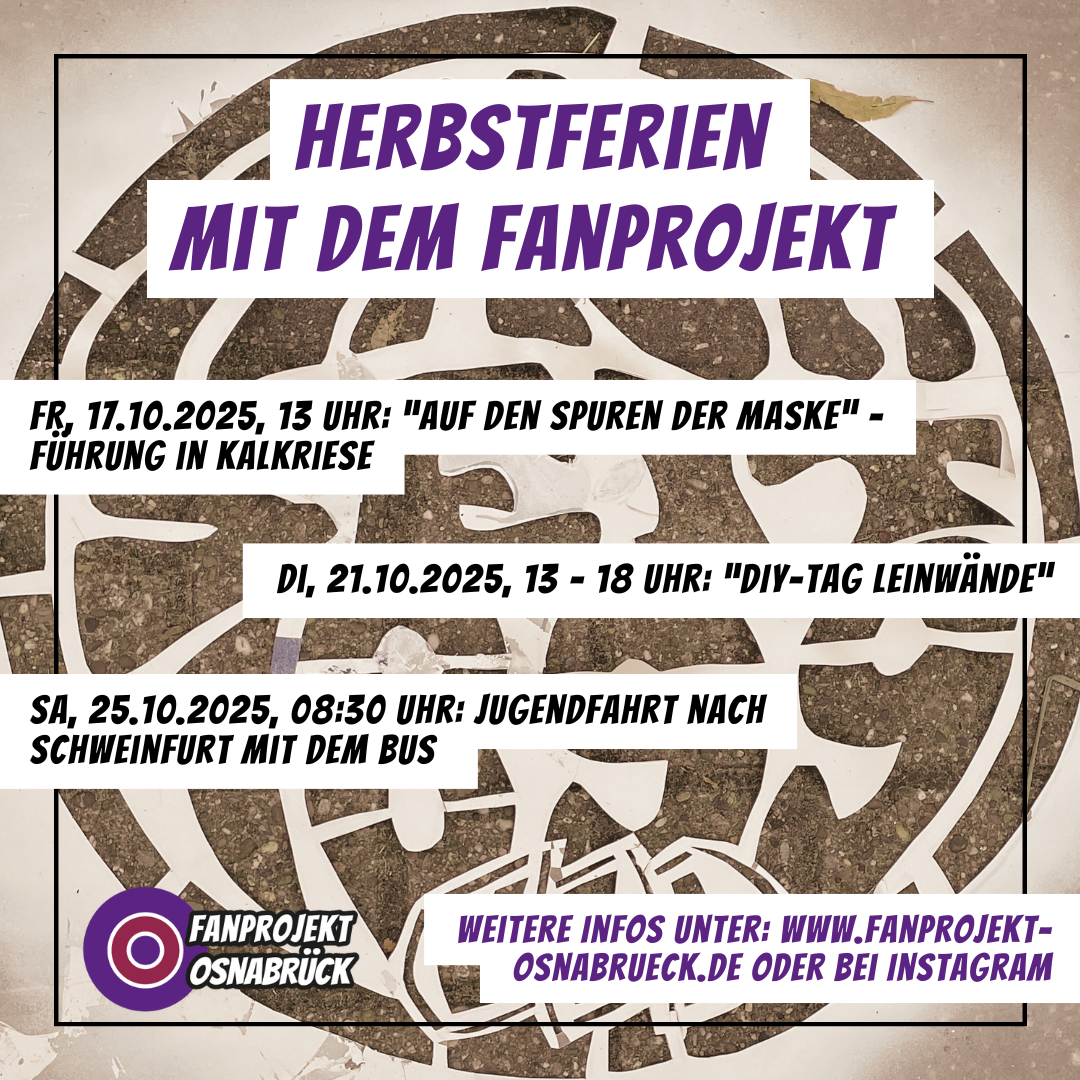 Herbstferien mit dem Fanprojekt Nach dem spielfreien Wochenende ist vor den Herbstferien und wir haben uns wieder ein „lila-weißes“ Programm für Euch ausgedacht. Freitag. 17.10.2025, 13 Uhr: „Auf den Spuren der Maske“ (13-17 Jahre) Erkunde mit uns den Ort der Varusschlacht in Kalkriese. Die Varus-Maske ist, wie auch Arminius, als Symbol untrennbar mit der Ultraszene […]